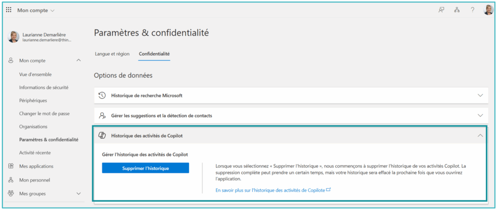 💡Bon à savoir : Vous pouvez supprimer votre historique à tout moment via “Mon Compte” > “Activité Copilot”. Ces données ne servent jamais à entraîner l’IA. Si votre entreprise le décide, l’administrateur peut aussi configurer une suppression automatique (mais ce n’est pas vous qui gérez ça),