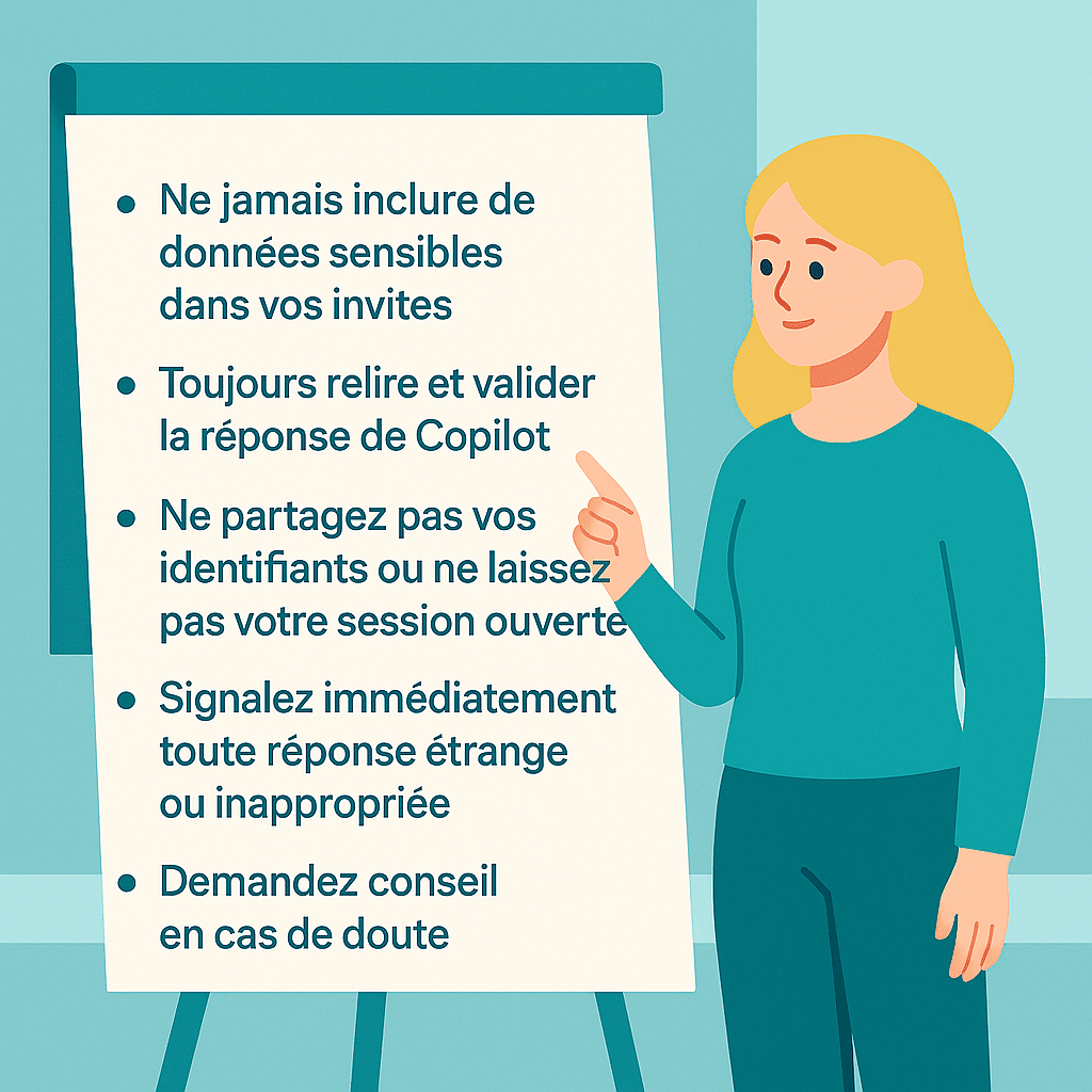 Avant d’utiliser Copilot sur un document confidentiel (RH, juridique, financier), demandez à votre manager ou au service informatique si c’est autorisé.