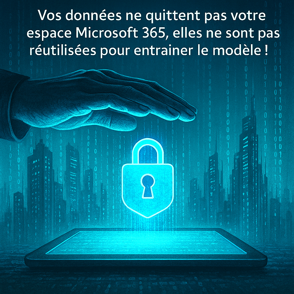 Vos données ne quittent pas votre espace Microsoft 365 (“tenant”), elles ne sont pas réutilisées pour entraîner le modèle, et elles sont chiffrées aussi bien “au repos” qu’en transit. Seul le prompt enrichi du contexte nécessaire est temporairement transmis au modèle d’IA hébergé sur Azure (sans stockage ni réutilisation).